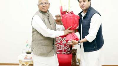 केंद्रीय मंत्री ज्योतिरादित्य सिंधिया ने राज्यपाल राजभवन पहुंचकर राज्यपाल मंगू भाई पटेल से मुलाकात की