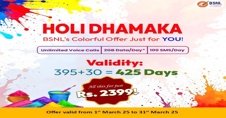 होली आने से पहले ही सरकारी टेलिकॉम कंपनी बीएसएनएल ने एक बड़ा धमाका कर दिया है। BSNL ने होली आने से ऐसा बड़ा धमाका किया है जिसने एयरटेल और वीआई की निंद उड़ा दी है। जहां निजी टेलिकॉम कंपनियां अपने रिचार्ज प्लान्स में ग्राहकों को अधिकतम 365 दिन की वैलिडिटी ऑफर कर रही हैं वहीं अब BSNL 425 दिन वाला प्लान लेकर आ गया है। आपको बता दें कि BSNL के पास निजी कंपनियों के तुलना में कहीं अधिक लंबी वैलिडीट वाले प्लान्स मौजूद हैं। कंपनी ने अपने पोर्टफोलियो में 70 दिन, 150 दिन, 160 दिन, 180 दिन, 336 दिन और 365 दिन तक चलने वाले प्लान्स शामिल कर रखें हैं। अब कंपनी ने होली के पहले 425 दिन वाला जबरदस्त रिचार्ज प्लान पेश कर दिया है।