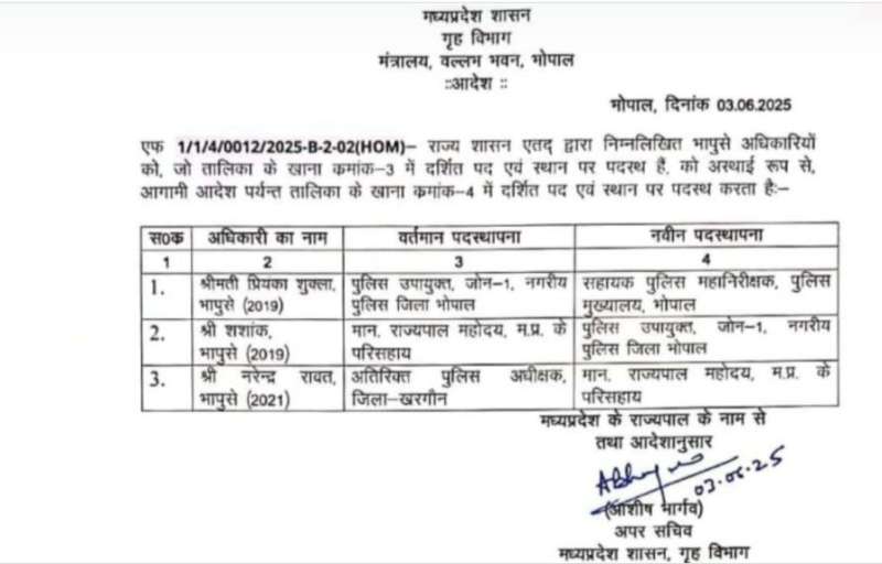 राज्यपाल के असिस्टेंट 2019 बैच के आइपीएस शशांक को अब नगरीय पुलिस जोन 1 में पुलिस उपायुक्त (DCP) बना दिया गया है। इसी तरह खरगोन के अतिरिक्त पुलिस अधीक्षक 2021 बैच के नरेंद्र रावत को अब गवर्नर के असिस्टेंट के रूप में पदस्थ किया गया है।