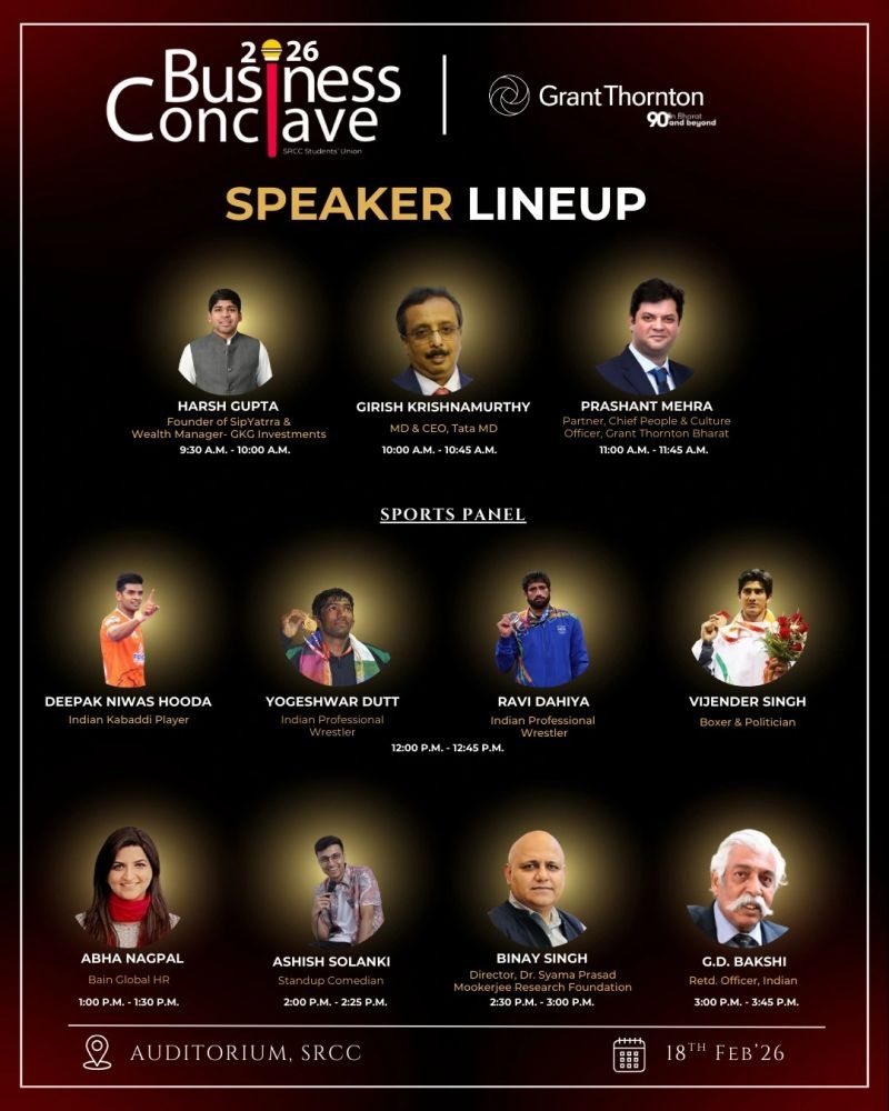 दिल्ली| श्री राम कॉलेज ऑफ कॉमर्स के शताब्दी वर्ष में आयोजित बिजनेस कॉन्क्लेव 2026 का सफल समापन उत्कृष्टता केवल उपलब्धि नहीं, बल्कि नीति, प्रगति और शांति के संतुलन से ही भविष्य का निर्माण संभव के संदेश के साथ हुआ। उत्कृष्टता की सदी... थीम के तहत तीन दिनों तक चले इस फ्लैगशिप इवेंट में देशभर के युवाओं ने बिजनेस, पॉलिसी, इनोवेशन और लीडरशिप पर मंथन किया और विचारों से भविष्य की रूपरेखा गढ़ी। एसआरसीसी के 100वें साल में आयोजित इस तीन दिवसीय कार्यक्रम ने देशभर के हजारों छात्रों को बिजनेस, पॉलिसी, इनोवेशन और लीडरशिप की दुनिया से रूबरू कराया। कार्यक्रम में अमर उजाला कार्यक्रम ने मीडिया पार्टनर की भूमिका निभाई। विद्यार्थियों ने इन प्रतियोगिताओं में अपनी टीम वर्क, विश्लेषणात्मक सोच, समस्या समाधान और रणनीतिक योजना बनाने की क्षमता को परखा।