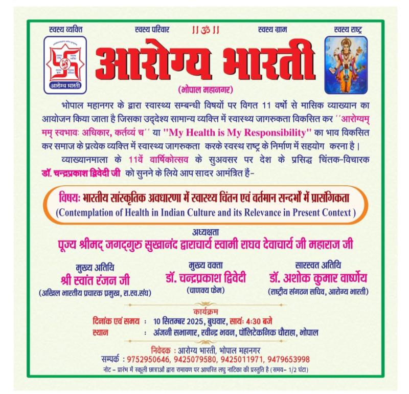 आरोग्य भारती, भोपाल महानगर पिछले 11 वर्षों से लगातार “My Health is My Responsibility” के मूलमंत्र पर आधारित मासिक स्वास्थ्य-व्याख्यानमाला का आयोजन कर समाज में स्वास्थ्य-जागरूकता का व्यापक प्रसार कर रहा है। इसका ध्येय है – आरोग्यम् मम् स्वभावः, अधिकारः, कर्तव्यं च” अर्थात् स्वास्थ्य को व्यक्तिगत जिम्मेदारी मानकर स्वस्थ समाज और राष्ट्र निर्माण में योगदान देना।