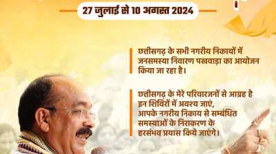 रायपुर. राज्य के सभी नगरीय निकायों में आज से जनसमस्या निवारण पखवाड़ा प्रारंभ हो गया है। उप मुख्यमंत्री तथा नगरीय प्रशासन एवं विकास मंत्री श्री अरुण साव ने सभी नगर...