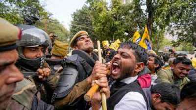 दिल्ली में पार्टी दफ्तर के बाहर आप कार्यकर्ताओं का बीजेपी के खिलाफ प्रोटेस्ट